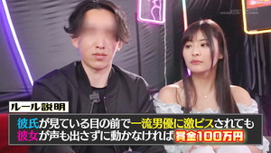 内容 / 似鳥日菜・佐藤愛瑠・朝比ゆの・松丸香澄。賞金100万円に目がくらんだバカップル!AV男優にヤラれて彼女が無反応なら100万円。反応するたびにマイナス1万円。パイ揉み・手マン・セックス。どんどん減る賞金!特別ボーナス狙いで、NGプレイのキス解禁!彼女は賞金なんかどうでも良くなった、彼氏の前でイキまくっちゃいます!!